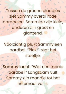 Hij loopt vrolijk de tuin in met zijn mandje, plukt de mooiste aardbeien en wast ze netjes n de keuken. Maar pas op voor de spetters! Daarna smult Sammy van zijn zelf geplukte aardbeien op een picknickkleed in de zon.